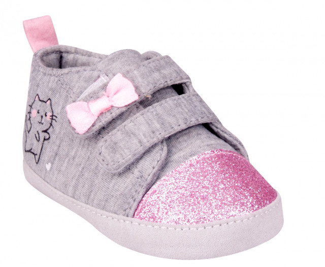 Tenisi gri pentru bebelusi. Sunt accesorizati cu fundita, partea din fata este roz, sclipitoare. Se inchid cu doua barete cu arici astfel incat bebelusul sa se poata incalta cu usurinta.