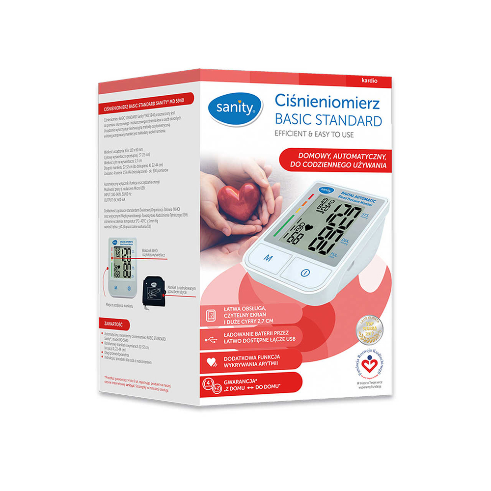 Tensiometru electronic de brat Sanity Basic Standard MD 5940, manseta 22-32 cm, memorare 2 utilizatori, 120 seturi de memorie, Alb Tensiometrul electronic de brat Sanity Basic Standard MD 5940 este destinat masurarii tensiunii arteriale sistolice si diastolice la adulti. Dispozitivul utilizeaza o metoda oscilometrica neinvaziva care detecteaza fluxul de sange prin artera brahiala pentru a masura tensiunea arteriala si pulsul. In acest fel, citirile pot fi obtinute rapid si usor fata a folosi un stetoscop. Rezultatele obtinute cu ajutorul tensiometrului electronic de brat Sanity Basic Standard sunt echivalente cu masuratorile efectuate de o persoana instruita, care foloseste un tensiometru mecanic si un stetoscop. Produsele marca Sanity se caracterizeaza prin manopera de inalta calitate si solutii practice si usor de utilizat. Produsele indeplinesc cerintele standardelor de siguranta, au trecut cu succes testele clinice si au primit certificate corespunzatoare, confirmarea conformitatii cu standardele Uniunii Europene. Eficient si usor de utilizat Tensiometrul electronic de brat Sanity Basic Standard MD 5940 este destinat pentru masurarea zilnica a tensiunii arteriale. Acesta este recomandat si persoanelor care sufera de hipertensiune arteriala, diabetici, cu malformatii cardiace congenitale sau dobandite dupa un infarct. Caracterisitici - Operare usoara; - Dimensiune dispozitiv: 8.3 x 11 x 6 cm; - Ecran clar si cifre mari de 2.7 cm; - Dimensiune manseta: 22-32 cm; - Functie suplimentara de detectare a aritmiei; - Destinat pentru 2 persoane; - Stocheaza 120 de masuratori pentru 2 utilizatori; - AVG - Functia de raportare medie pe 7 zile; - Alimentare: 4 baterii 1.5V AAA (incluse in pachet); - Port Micro USB pentru alimentare; - Oprire automata si functie de economisire a energiei; - Tensiune de alimentare: 100-240 V, 50 60 Hz. Descrierea componentelor dispozitivului Cum se efectueaza masurarea? 1. Infasurati strans manseta in jurul bratului, cu cordonul pe partea interioara a bratului. Manseta este infasurata corect, atunci cand puteti pune cu usurinta degentul intre brat si manseta; 2. Stati confortabil cu antebratul pe o suprafata plana (asa cum se arata in imaginea de mai jos). Amintiti-va ca manseta de pe brat, trebuie sa fie in linie cu inima; 3. Porniti dispozitivul. Masurarea va incepe automat si rezultatul va aparea pe ecran dupa putin timp. Daca este detectata o aritmie, pe ecran va aparea o iconita sub forma de inima. Semnele de pe afisaj Utilizarea unui adaptor (accesorii vandute separat): 1. Conectati adaptorul de alimentare la o priza electrica de 110 - 240 V, 50 60 Hz; 2. Conectati mufa Micro USB la portul USB al dispozitivului. Portul Micro USB este doar pentru alimentare. Portul USB nu poate fi utilizat pentru descarcarea datelor. Standarde Acuratele conform standardelor Organizatiei Mondiale a Sanatatii (OMS) si ghidurilor Societatii Internationale de Hipertensiune (ISH): - Presiune in intervalul de temperatura 5 C - 40 C: 3 mm Hg; - Vaorea ritmului cardiac: 5% (fluctuatie permisa de 5%) Continutul pachetului: - Tensiometrul electronic de brat Sanity Basic Standard MD 5940; - Manseta confortabila cu dimensiuni de 22 - 32 cm; - 4 baterii 1.5V AAA; - Furtun lung de aer; - Manual de instructiuni. Tensiometrul electronic de brat Sanity Basic Standard MD 5940 este in conformitate cu Directiva Consiliului European 93 42 CEE privind dispozitivele medicale. Aceasta inseamna ca marcajul CE de conformitate este aplicat pe numarul de referinta al organismului de certificare.,