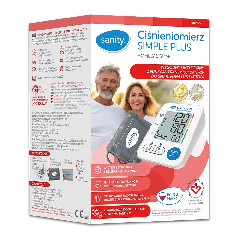 Tensiometru electronic de brat Sanity Simple Plus, memorare 2 utilizatori, manseta 22 - 32 cm, detectare aritmie, detectie miscarea corpului, ecran LCD iluminat, cablu UBS, Bluetooth, husa depozitare Sanity Simple Plus este tensiometrul electronic de brat ideal pentru monitorizarea zilnica a tensiunii arteriale, potrivit pentru intreaga familie. Aparatul este conceput pentru persoanele cu hipertensiune arteriala, pacientii diabetici sau cei cu afectiuni cardiace congenitale sau dobandite, precum si pentru cei care au suferit un infarct miocardic. Caracteristici cheie: Transfer de date Convenabil si intuitiv, tensiometrul permite transferul usor de date catre smartphone sau laptop; Asociati un dispozitiv inteligent cu tensiometrul Dupa masurarea tensiunii arteriale, salvati si trimiteti datele pe un dispozitiv inteligent, cum ar fi un smartphone sau tableta, utilizand conexiunea wireless Bluetooth. Aceasta functionalitate asigura un control usor si eficient al sanatatii tale; Masurare rapida si blanda Sistemul avansat ofera o masurare rapida si precisa a tensiunii arteriale, fara disconfort; Detectare aritmie Functia inteligenta de detectare a aritmiei iti ofera informatii suplimentare despre sanatatea ta cardiovasculara; Detectarea miscarii corpului Tehnologie care asigura precizia masuratorii, detectand orice miscare corporala in timpul procesului; Memorare pentru 2 utilizatori Capacitatea de a stoca pana la 199 de masuratori pentru 2 utilizatori diferiti, ideal pentru folosirea de catre mai multe persoane; Functie medie (AVG) Calculeaza media ultimelor 3 masuratori pentru o evaluare corecta a tensiunii arteriale; Ecran LCD mare si iluminat Afisajul generos de 60 x 64 mm este usor de citit, chiar si in conditii de iluminare redusa; Senzor de plasare corecta a mansetei Asigura pozitionarea corecta a mansetei pentru rezultate precise; Conform OMS Rezultatele sunt clasificate conform standardelor Organizatiei Mondiale a Sanatatii (OMS). Specificatii tehnice: - Display digital LCD cu dimensiuni: 60 x 64 mm; - Greutate: 234 g (fara baterie si manseta); - Functie de economisire a energiei si indicator pentru baterie descarcata; - Alimentare prin cablu USB-C (intrare: 100 - 240 V) sau 4 baterii alcaline AAA (incluse in pachet); - Manseta ajustabila: 22-32 cm; - Husa de depozitare inclusa pentru transport si protectie. Pachetul contine: - Tensiometru electronic de brat Sanity Simple Plus; - Manseta ajustabila: 22-32 cm; - Cablu USB tip C; - 4 baterii alcaline AAA; - Husa depozitare; - Manual de utilizare in limba romana. Sanity Simple Plus combina precizia cu usurinta de utilizare, oferind o experienta de masurare fara efort si completa, pentru un control optim al tensiunii arteriale.,