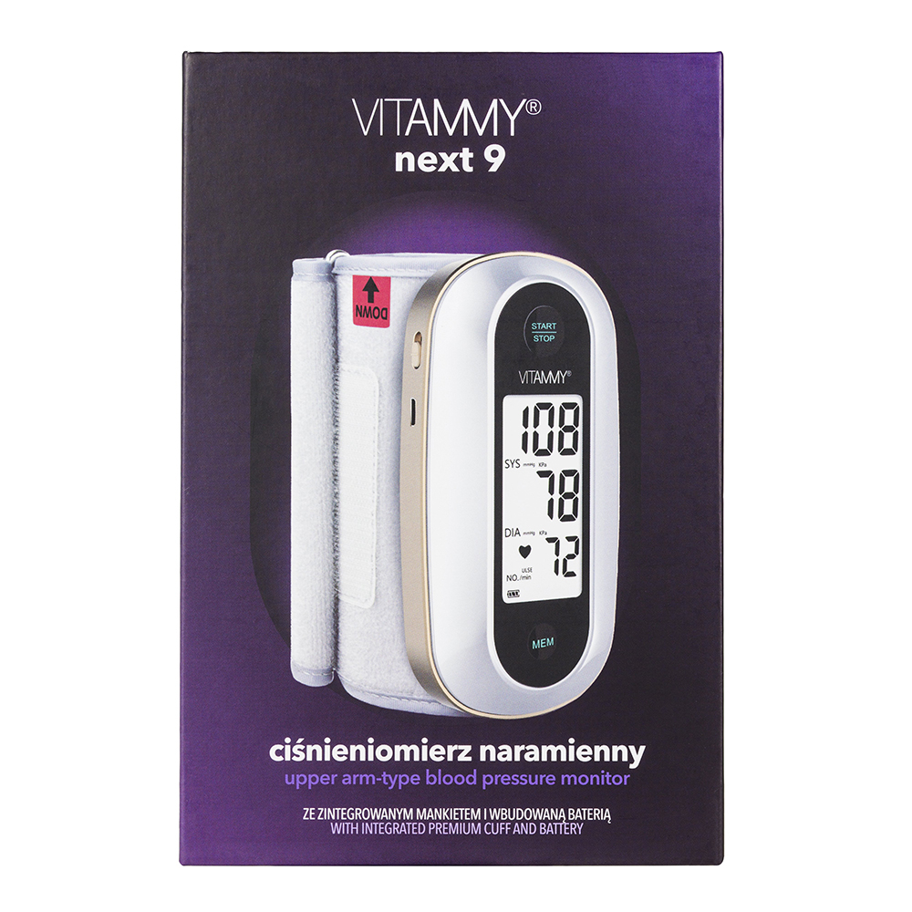 Tensiometru electronic de brat Vitammy Next 9, mufa USB, detectare aritmie, manseta integrata 23-36 cm, 120 seturi de memorie, Alb Auriu Tensiometrul electronic de brat Vitammy Next 9 este un dispozitiv digital, complet automat pentru masurarea tensiunii arteriale. Acesta este destinat utilizarii de catre adulti acasa sau pentru uz profesional in cabinetul medicilor. Tensiometrul Next 9 permite masurarea foarte rapida si fiabila a tensiunii arteriale sistolice si diastolice, precum si masurarea pulsului. Acesta ofera acuratele si confort de utilizare dovedit clinic. Design integrat cu manseta Stiti cati factori afecteaza rezultatul corect al masurarii tensiunii arteriale? Specialistii Vitammy, pe baza acestor cunostinte au creat cel mai recent model de tensiometru Next 9 . Pentru a raspunde nevoilor pacientilor cu probleme cardiace, a fost creat acest model de tensiometru Next 9 , care, datorita designului integrat al dispozitivului cu manseta, face masurarea mai rapida si mai convenabila. De ce Next 9? - Portabil; - Dispozitiv medical certificat; - Manseta integrata de 23 cm - 36 cm; - Baterie cu litiu incorporata de 640 mAh; - Cablu micro USB; - Ecran LCD digital cu cristale lichide; - Memorie 120 rezultate; - Dimensuni mici 120 x 66 x 30 mm; - Greutate 226,3 g (fara adaptor). Fara cabluri Nu exista cabluri care sa lege tensiometrul Vitammy Next 9 de manseta. Este mai usor si mai rapid sa aplici manseta pe brat. Masurarea se face pe artera brahiala. Efectuarea masuratorii la nivelurile superioare ale sistemului arterial este o garantie a unei masuratori mai precise, in comparatie cu masurarea facuta la incheietura mainii. Inovatie - Tensiometrul Next 9 cu baterie si cablu USB Gata cu schimbarea plictisitoare a bateriei! Vitammy Next 9 este un tensiometru cu baterie incorporata pe care o puteti incarca cu usurinta printr-un port USB. Aceasta solutie reduce costurile de operare si este mai ecologic. Nu mai trebuie sa va faceti grji daca dispozitivul are o baterie functionala. Primiti tensiometrul Next 9 intr-un pachet cu un cablu USB care va permite sa reincarcati rapid bateria oriunde v-ati afla. Confort maxim pentru masurarea tensiunii arteriale Bunastarea dumneavoastra este importanta! Starea dumneavoastra mentala are un impact mare asupra tensiunii arteriale. De aceea, tensiometrul Next 9 foloseste toate solutiile posibile pentru ca controlul zilnic sa nu fie impovarator, sa ruleze rapid si sa dea un sentiment de satisfactie ca aveti grija de sanatatea dumneavoastra ca si cand profesionistii ar avea grija de asta. Manseta este realizata din materiale de inalta calitate, care nu contin latex, iar circumferinta acesteia este de 23 - 36 cm. Ecran LCD digital Ecranul LCD clar, cu dimensiuni de 58 x 30 mm va facilita citirea rapida a rezultatelor. Memoria de 120 rezultate Daca medicul dumneavoastra v-a recomandat sa tineti o evidenta a rezultatelor dumneavoastra si tot uitati de asta, cu siguranta va veti bucura de functia de memorie a tensiometrului Vitammy Next 9 . Acesta va permite sa va amintiti rezultatele masuratorilor anterioare, ceea ce permite controlul si observarea constanta a schimbarilor in activitatea inimii. Descrierea dispozitivului 1 - Tensiunea ateriala Sistolica; 2 - Tensiunea arteriala Diastolica; 3 - Ritmul cardiac; 4 - Simbol memorie; 5 - Simbol batai inima; 6 - Starea bateriei; 7 - Simbol sunet; 8 - Simbol medie masuratori; 9 - Simbol batai inimi neregulate. Cheia pentru fiabilitatea maxima a rezultatelor masurarii tensiunii arteriale este nu numai tensiometrul de cea mai buna calitate, ci si constientizarea modului de masurare corect. In pachet, impreuna cu tensiometrul Vitammy Next 9 , primiti un manual de utilizare, in care veti gasi informatii nu numai despre parametrii tehnici ai dispozitivului, ci si informatii complete despre cum sa masurati corect pentru a fi sigur ca a fost facuta corect si precis, ca in cabinetul unui medic. Demn de incredere - dispozitiv medical certificat Tensiometru electronic de brat Vitammy Next 9 este un dispozitiv medical certificat cu un Cerficiat CE (Certificat de conformitate) emis de un organism autorizat notificat UE: TUV SUD PRODUCT SERVICE GMBH RIDLERSTR 65, D-80339 MUNCHEN, GERMANIA. Aveti parte de liniste sufleteasca folosind un tensiometru care respecta o serie de cerinte privind fiabilitatea masuratorilor, imunitatea la interferente electromagnetice, siguranta utilizarii, etichetarea corecta a produsului etc. O garantie ca promisiune a calitatii Vitammy Tensiometru electronic de incheietura VITAMMY Next 9 beneficiaza de o garantie de 2 ani, ca parte a promisiunii de calitate a brandului Vitammy, care include asigurarea calitatii tehnice a dispozitivului, masurarea si valoarea de utilizare a dispozitivului, precum si asistenta utilizatorului in termeni de service si depanare. Pachetul contine: - Tensiometru electronic de brat Vitammy Next 9 cu manseta integrata; - Cablu USB; - Manual de utilizare.,