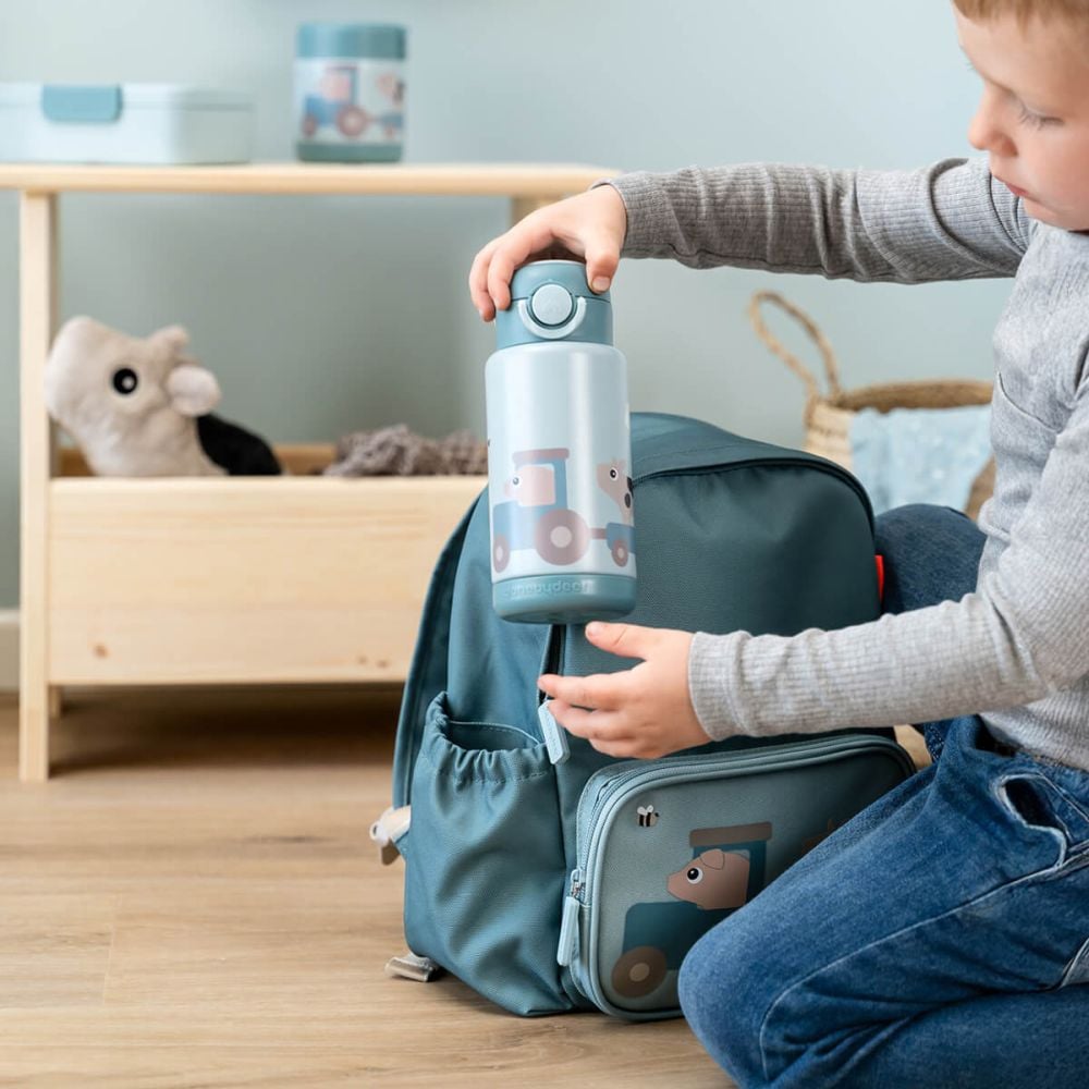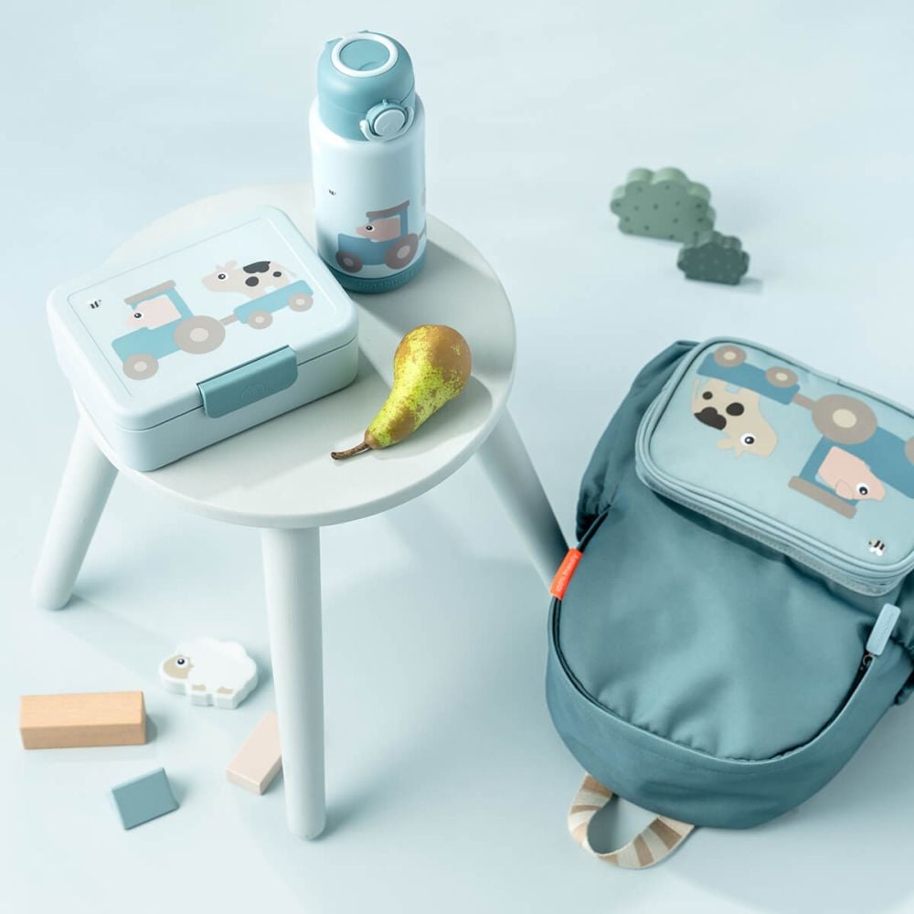 Daca vrei un recipient etans, usor de folosit si rezistent, Termos Done by Deer Tiny Farm Blue 340ml ofera combinatia perfecta intre functionalitate, siguranta si design prietenos pentru cei mici.