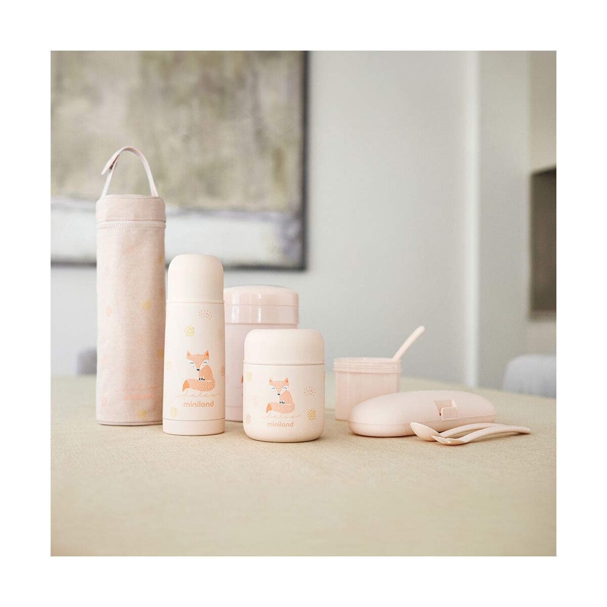 Termos pentru piureuri și alte alimente pentru bebeluși, cu o capacitate de 280 ml. Ușor de întreținut și curățat, este foarte convenabil pentru hrănirea bebelușului direct din termos, eliminând nevoia de vase suplimentare atunci când sunteți în mișcare. Calitate excepțională, ideal pentru menținerea temperaturii alimentelor timp de mai multe ore, datorită celor 3 straturi izolatoare și a unui finisaj cauciucat care îl protejează de impacturi, făcându-l mai silențios. Potrivit pentru toate tipurile de alimente solide. Ideal de la primele piureuri până la toate tipurile de alimente solide.   Materiale de o calitate excepțională, cele mai bune de pe piață! Cu un perete dublu de oțel și un strat exclusiv de cupru. Fabricat din oțel inoxidabil 18/8 (oțel inoxidabil 304), care are o conductivitate termică foarte scăzută și o rezistență excelentă la temperaturi ridicate.   Cel mai potrivit pentru conservarea alimentelor. Perfect pentru hrănirea directă din recipient. Foarte potrivit pentru hrănirea bebelușului direct, fără a fi nevoie să transferați conținutul într-un bol sau o farfurie.    Design inspirat de moliciunea și căldura naturii. Cu un finisaj neted și plăcut, asemănător cauciucului, prezintă motive încântătoare inspirate din natură. Un design prietenos, relaxant și dulce, care completează cu ușurință orice stil. Convenabile pentru utilizare în deplasare. Au dimensiunea ideală pentru a fi luate oriunde.    Perfecte pentru călătorii sau pentru a lăsa bebelușul în grija altcuiva.    Compatibil cu gentuta termica thermibag  cod 89579.   Fără bisfenol A.   100% fără BPA.   Dimensiuni(Lxlxh) cm 8.2 x 8.2 x 11.5