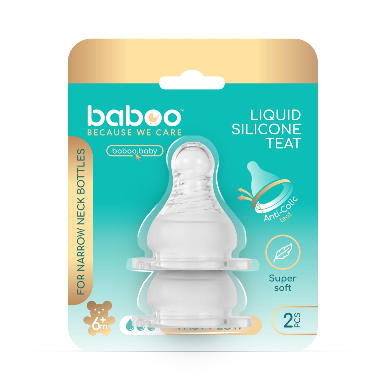 Tetina din silicon Baboo® pentru biberon cu gât îngust răspunde nevoilor de hrănire în creștere ale bebelușului dumneavoastră, oferind o experiență de hrănire confortabilă și naturală și un flux mai rapid.