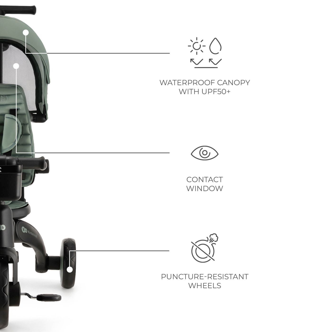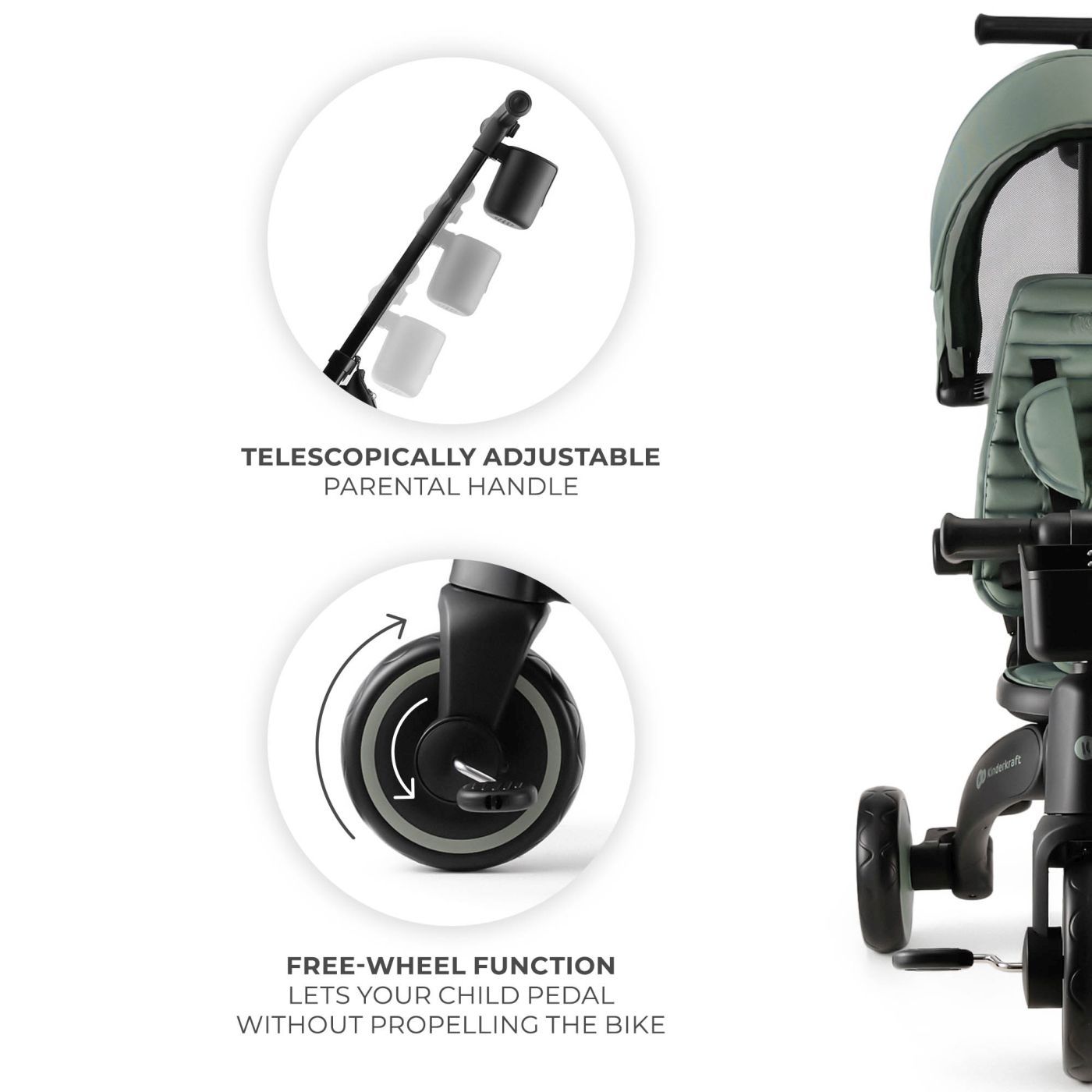 Tricicleta multifunctionala 5 in 1 KINDERKRAFT JAZZ 2, GREEN pentru copii intre 9 luni si 5 ani Va prezentam KINDERKRAFT JAZZ 2 GREEN tricicleta pliabila moderna 5 in 1, proiectata pentru copiii intre 9 luni si 5 ani. Aceasta tricicleta multifunctionala creste impreuna cu copilul tau, adaptandu-se nevoilor sale in fiecare etapa de dezvoltare. 5 moduri de utilizare o singura tricicleta pentru multi ani KINDERKRAFT JAZZ 2 GREEN ofera configuratii diferite, pe care le poti adapta cu usurinta la varsta si abilitatile copilului Etapa timpurie (9-18 luni) control total al parintelui cu masuri de protectie pentru cei mai mici dintre copii. Etapa de invatare (18-24 luni) copilul incepe sa pedaleze, in timp ce parintele continua sa controleze directia. Etapa de antrenament (2-3 ani) cel mic este mai independent si invata sa pedaleze si sa controleze directia. Etapa de independenta (3-4 ani) copilul merge singur pe tricicleta. Etapa de expert (4-5 ani) transformarea intr-o bicicleta fara pedale pentru cei mai avansati mici biciclisti. Pliere compacta ideala zi de zi si in calatorii Datorita constructiei bine gandite, KINDERKRAFT JAZZ 2 GREEN se poate plia in cateva secunde fara a utiliza unelte. Dupa pliere, bicicleta ocupa putin spatiu, acest lucru facand transportul si depozitarea mai usoare, chiar si in spatiile mici. Dupa pliere pastreaza o pozitie stabila, asa ca o poti depozita atat vertical, cat si orizontal. Scaun pivotant CLICK&TWIST flexibilitate si confort Scaunul care se roteste la 360° permite asezarea copilului cu fata sau spatele catre directia de mers. Aceasta solutie ii permite celui mic sa se simta in siguranta, permitandu-i contactul vizual cu parintele sau observarea lumii inconjuratoare. În plus, reglarea scaunului se poate face in ambele pozitii, potrivind bicicleta la inaltimea copilului si oferindu-i astfel confort sporit. Reglare pe mai multe niveluri potrivita pentru nevoi care se schimba rapid KINDERKRAFT JAZZ 2 GREEN este dotata cu un maner telescopic pentru parinte, scaun si parasolar reglabile. Aceste functii permit adaptarea perfecta a bicicletei la nevoile copilului si preferintele insotitorului, oferind o utilizare confortabila si ergonomica. Siguranta si control liniste pentru parinte Tricicleta KINDERKRAFT JAZZ 2 GREEN este dotata cu centuri de siguranta in 5 puncte, bariera detasabila si manere antialunecare. Functia de pedalare libera ii permite copilului sa invete sa pedaleze in timp ce parintele are control deplin asupra directie de deplasare. Perfecta pentru orice vreme protectie tot anul Copertina impermeabila cu filtru UPF50+ il protejeaza pe copil de soare si ploile usoare. Unghiul de inclinare se poate regla pentru a asigura protectia optima in diferite conditii de vreme. În plus, fereastra incorporata permite observarea discreta a celui mic in timpul plimbarii. Prin alegerea tricicletei KINDERKRAFT JAZZ 2 GREEN, investesti intr-o bicicleta multifunctionala, care se adapteaza la nevoile copilului tau, asigurandu-i protectia, confortul si bucuria de a descoperi lumea in fiecare etapa de dezvoltare. KINDERKRAFT JAZZ 2 GREEN Tricicleta pliabila 5 in 1 pentru copii de la 9 luni la 5 ani ✔ Creste impreuna cu copilul cele 5 moduri de utilizare permit adaptarea bicicletei la varsta si abilitatile copilului, de la primele plimbari la mersul independent. ✔ Pliere compacta sistemul de pliere rapida permite plierea bicicletei in cateva secunde fara a folosi unelte, facand mai usoare transportul si depozitarea, chiar si in spatii mici. ✔ Scaun pivotant 360° datorita functiei CLICK&TWIST copilul poate calatori cu fata sau spatele catre directia de mers, bucurandu-se de sentimentul de siguranta si mai mult confort. ✔ Siguranta si control deplin centurile in 5 puncte, bariera detasabila si functia de pedalare libera ii permit copilului sa invete sa pedaleze in timp de parintele controleaza directia de deplasare. ✔ Confort in orice conditii copertina impermeabila cu UPF50+, manerul pliabil pentru parinte si rotile amortizate EVA asigura atat confortul copilului, cat si al insotitorului. Specificatii Materialul cadrului plastic Materialul rotilor EVA Dimensiuni Înaltimea bicicletei depliate pana la manerul parintelui 92-100 cm Înaltimea bicicletei depliate pana la copertina 70 cm Lungimea bicicletei depliate cu maner 125 cm Lungimea bicicletei depliate fara maner 93,5 cm Latimea bicicletei depliate 52,5 cm Adancimea scaunului 19 cm Latimea scaunului 20 cm Latimea spatarului 22 cm Lungimea spatarului 40 cm Distanta de la sol la maner 48,5-51,5 cm Diametrul rotilor din fata 20 cm Diametrul rotilor din spate 17 cm Distanta dintre rotile din spate 52,5 cm Înaltimea bicicletei pliate fara maner, cu copertina 78 cm Înaltimea bicicletei pliate fara maner, fara copertina 65 cm Latimea bicicletei pliate fara maner 34 cm Lungimea bicicletei pliate fara maner 34 cm