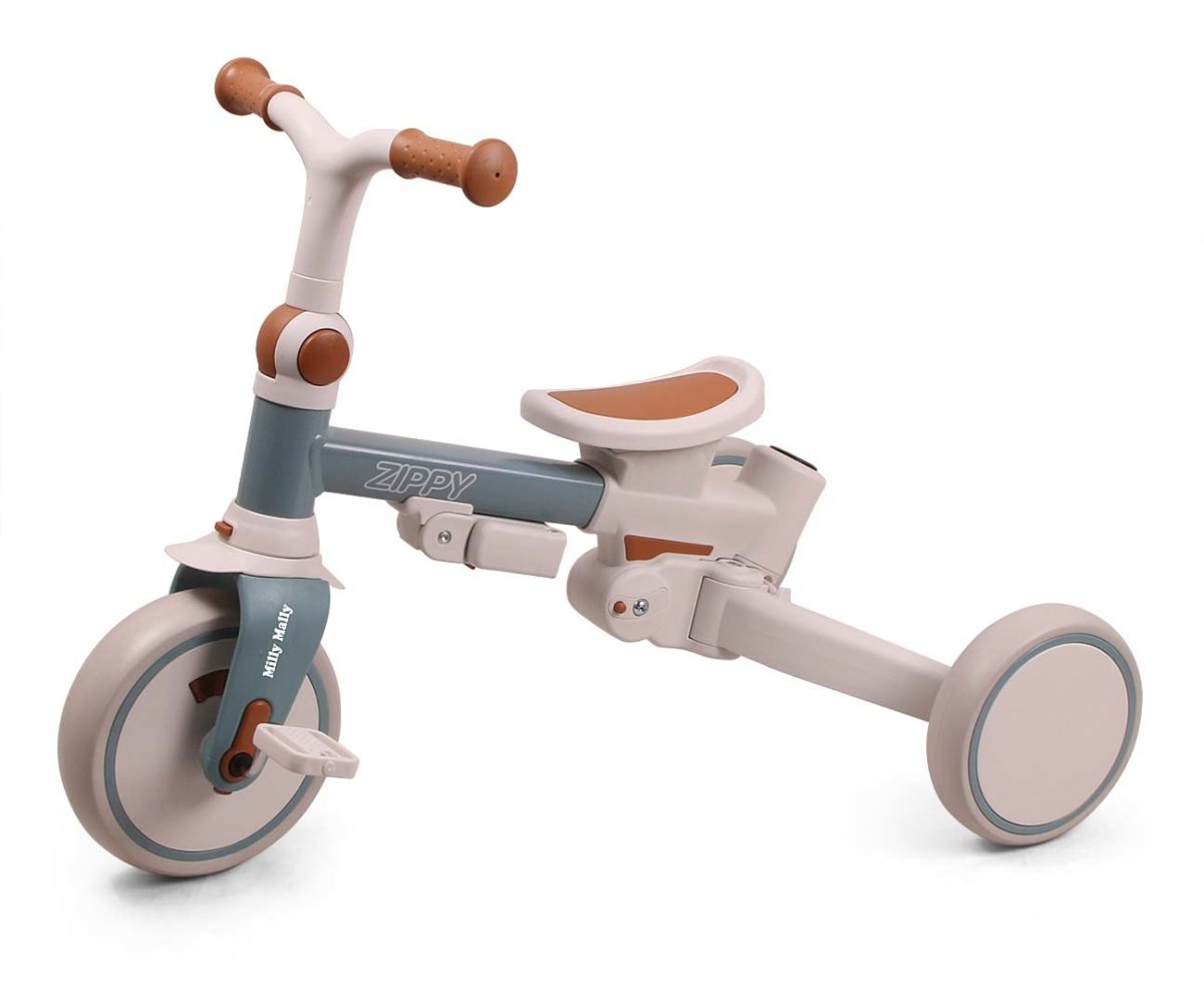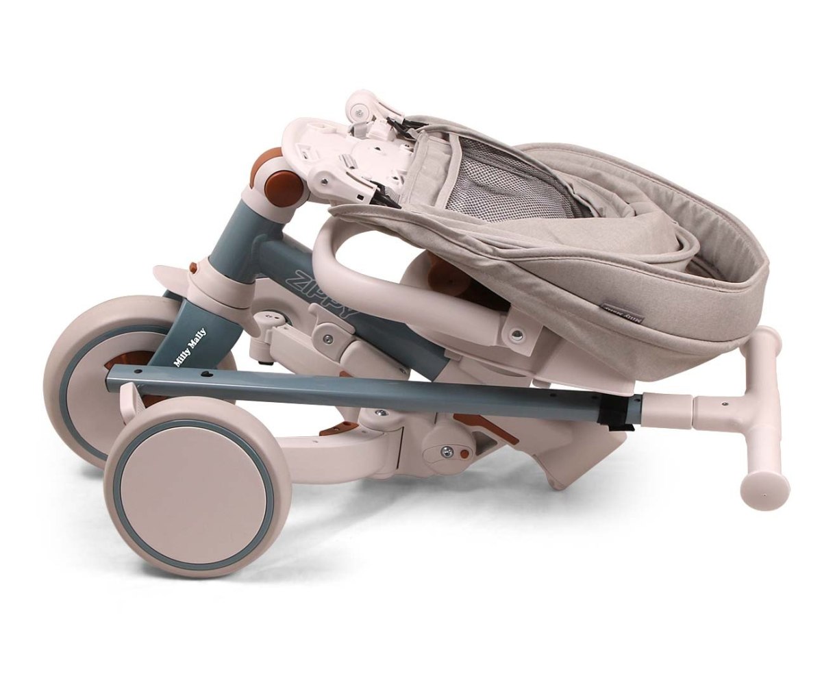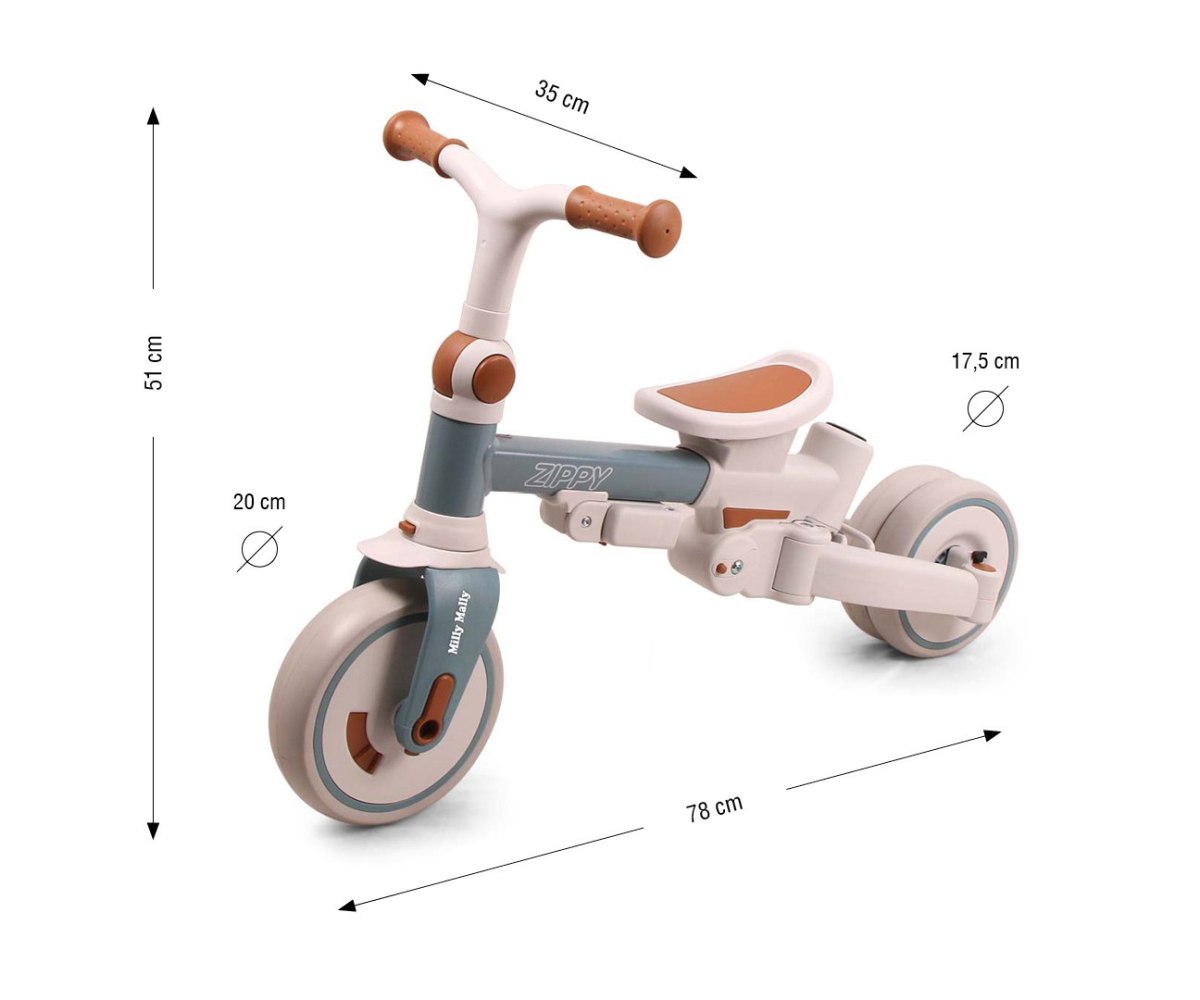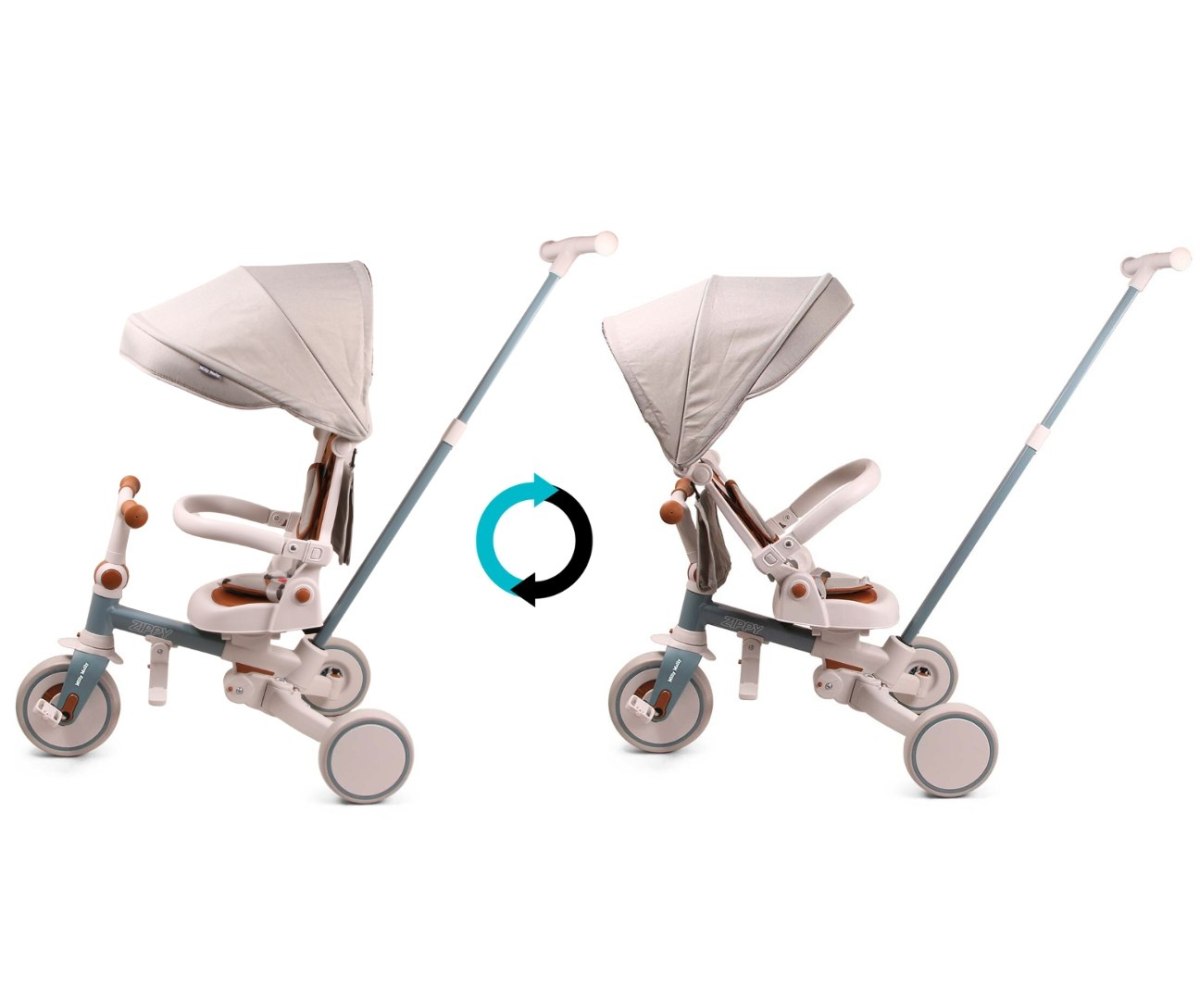 ZIPPY a fost gandita pentru confortul si siguranta celor mici si pentru comoditatea parintilor. Constructia stabila si moderna include sezut rotativ 180 de grade, astfel incat copilul poate calatori cu fata sau cu spatele la directia de mers. Bariera de siguranta, pasele de siguranta reglabile si suportul de picioare asigura pozitionarea corecta si protejeaza copilul in timpul plimbarii. Dupa indepartarea manerului, barierei si copertinei, ZIPPY devine tricicleta clasica, iar ulterior – prin alipirea rotilor din spate si scoaterea pedalelor – o bicicleta fara pedale (balance bike).