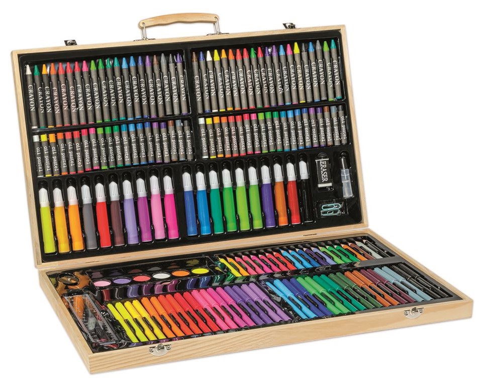 • Trusa de desen si pictura pentru copii, in valiza de lemn, 157 accesorii si culori, carioci, acuarele, pensula incluse