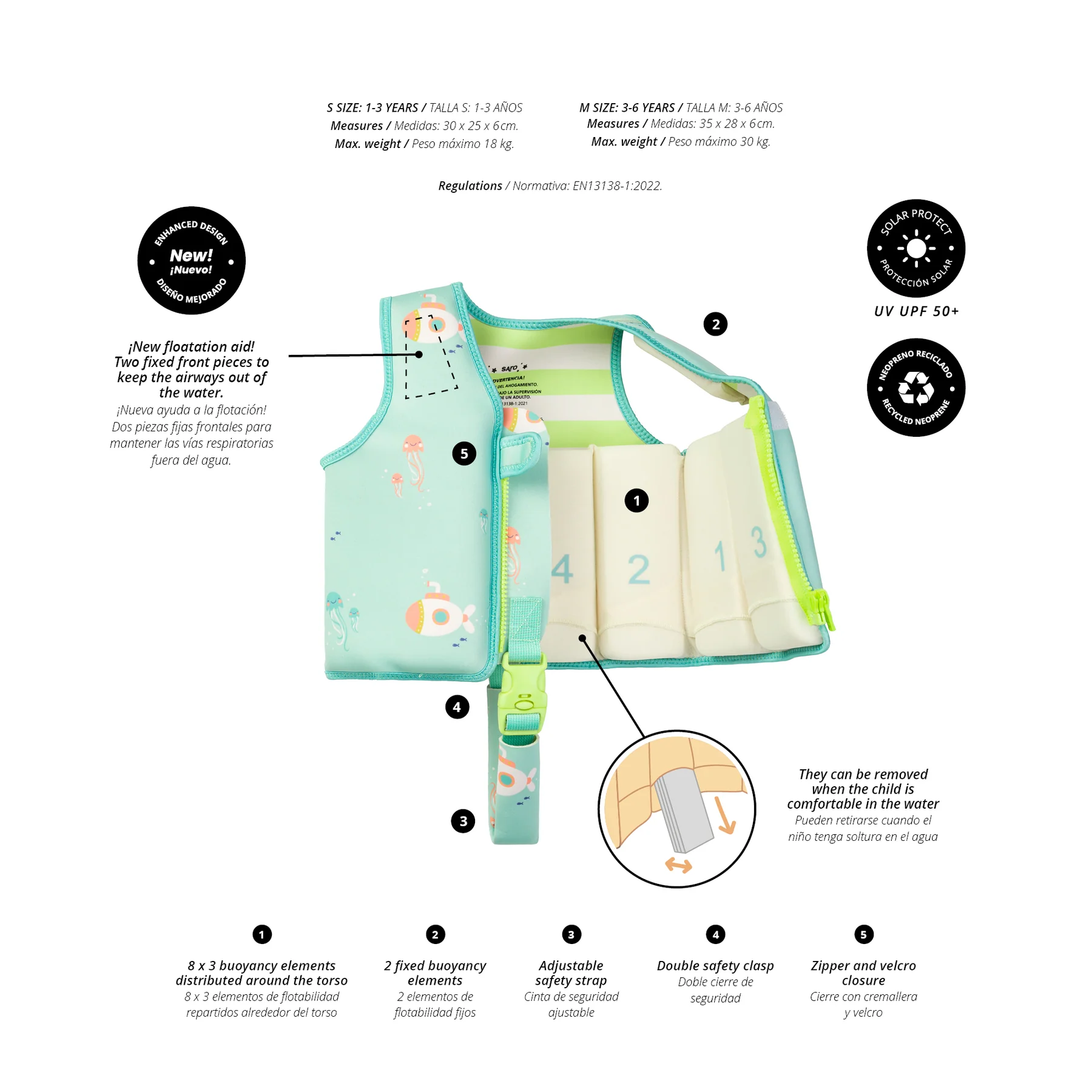 Siguranta, confort si distractie in apa Vesta de salvare Saro este accesoriul perfect pentru ca micutul tau sa invete sa inoate confortabil si in deplina siguranta. O combinatie ideala de protectie, versatilitate si design prietenos, creata special pentru cei mici. Caracteristici unice care fac diferenta: Sistem evolutiv de flotatie 8 compartimente cu cate 3 piese de flotatie in fiecare (24 piese in total) Piesele pot fi indepartate treptat, permitand adaptarea perfecta pe masura ce abilitatile de inot se imbunatatesc Avantaj exclusiv: Alte veste au doar 8 piese de flotatie, ceea ce face ca adaptarea sa fie mai brusca si mai dificila Protectie superioara Doua piese fixe frontale special concepute pentru a mentine caile respiratorii departe de apa Protectie UV UPF 50+ care protejeaza pielea delicata a copilului in timpul jocului in soare Materiale fabricate din surse reciclate , prietenoase cu mediul inconjurator Confort si siguranta maxima Curea reglabila intre picioare cu inchidere dubla de siguranta Previne alunecarea vestei peste cap in timpul scufundarilor sau al jocului in apa Protectie din neopren care elimina frecarea si iritatiile la nivelul picioarelor Material moale si placut la atingere pentru confort extins Bucura-te de apa ca un adult! Fa din experienta la piscina sau la plaja un moment de neuitat pentru copilul tau. Cu vesta de inot Saro, ofera-i siguranta, libertate si incredere in explorarea minunata a lumii acvatice! Dimensiune Varsta Greutate Conturul pieptului S. 1 - 3 ani 9 - 18 kg 51 - 56 cm M. 3 - 6 ani 18 - 30 kg 56 - 61 cm Dupa utilizare, clatiti cu apa proaspata si lasati sa se usuce la aer, evitand expunerea directa la lumina soarelui. Nu folositi inalbitor, uscator de rufe sau fier de calcat. Conform cu EN13138-1:2022.